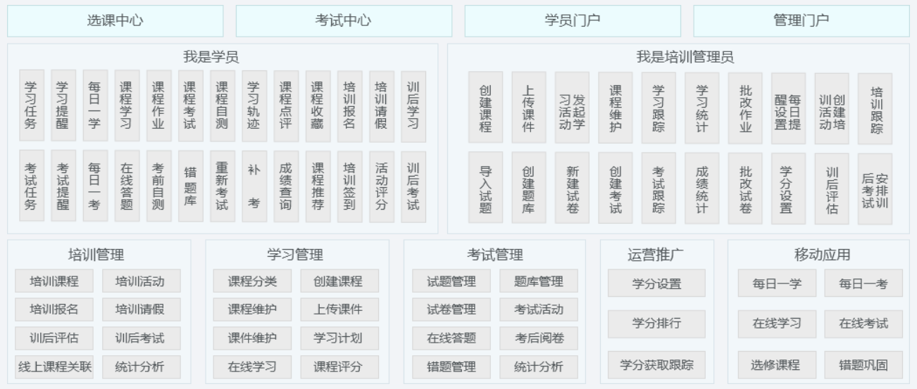 培训学习平台涵盖培训管理、学习管理、考试管理、运营推广、移动应用等几大模块,并针对学员、导师、培训管理员配置不同功能。借助平台,可实现从培训、学习、考试、评分到归档等全流程在线进行,并进行全周期线上管理。如果企业需要进行线下培训,亦可通过直播、录播将课程保存至线上。