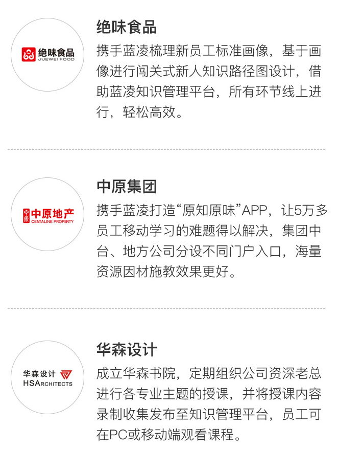 顺应当前互联网+学习培训的发展方向,蓝凌结合在智慧办公、知识管理领域18年的专业沉淀,融合国内外知识管理、员工培训的最佳实践,同步员工岗位与能力体系建设,为不同类型及学习培训发展阶段的企业,提供新一代移动学习培训解决方案,帮助企业开展体系化、在线化、移动化、游戏化、个性化的学习培训工作,激发学习型组织创造更大价值,打造“学习强企”!